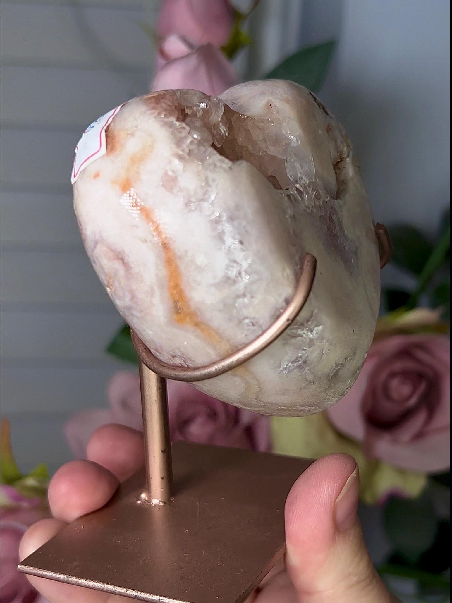 Beautiful, pink amethyst heart in peach tones with stand