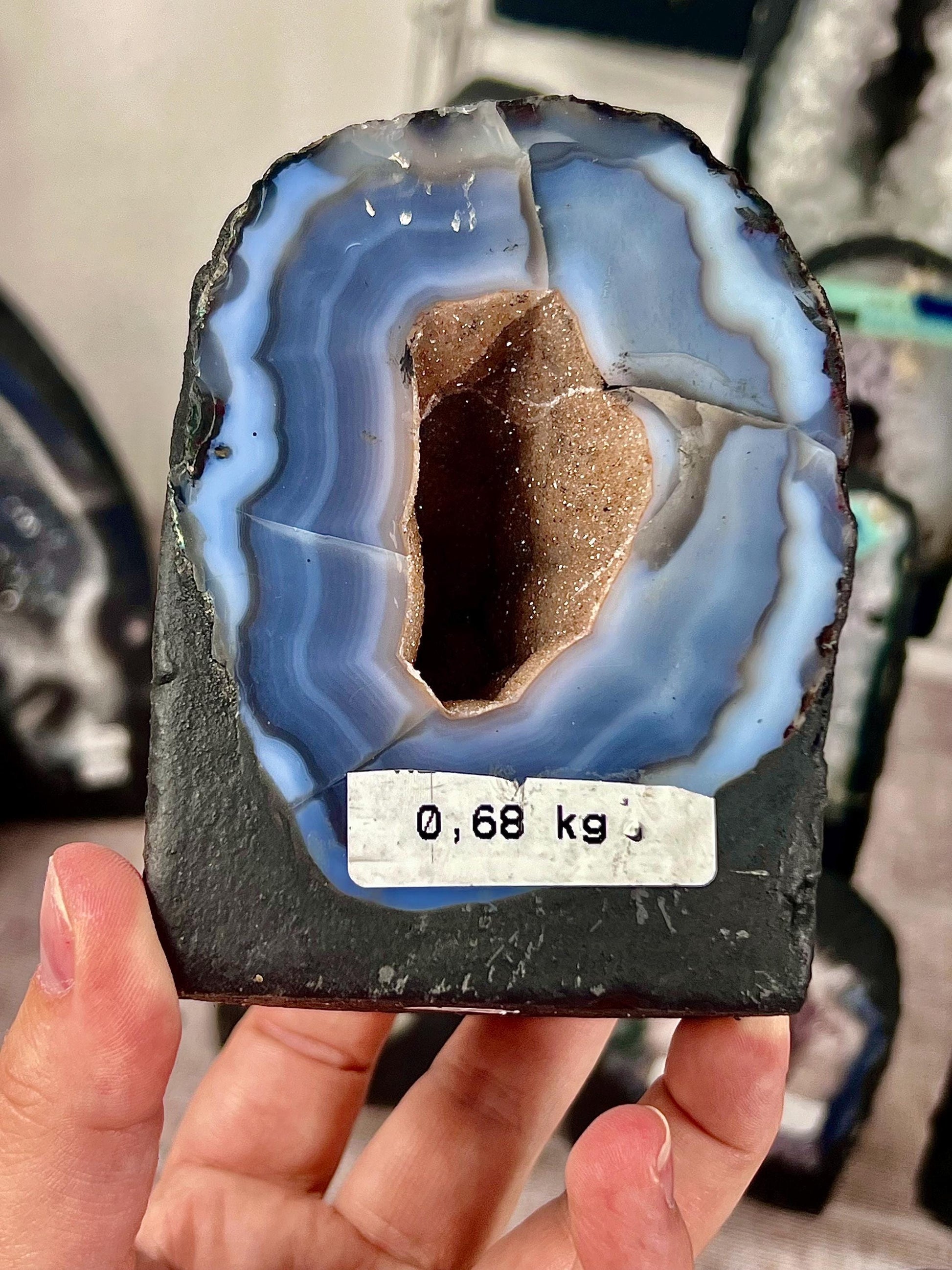 Beautiful, small,blue agate cathedral with peach sugar druzy 680g