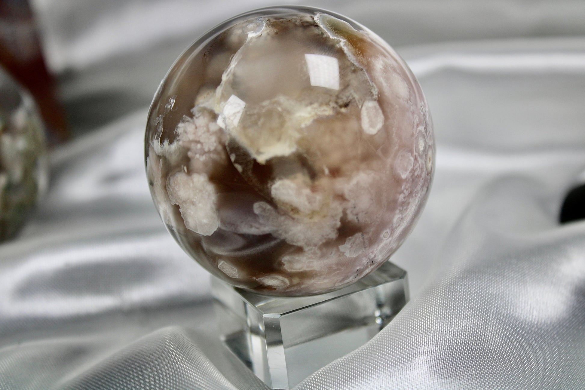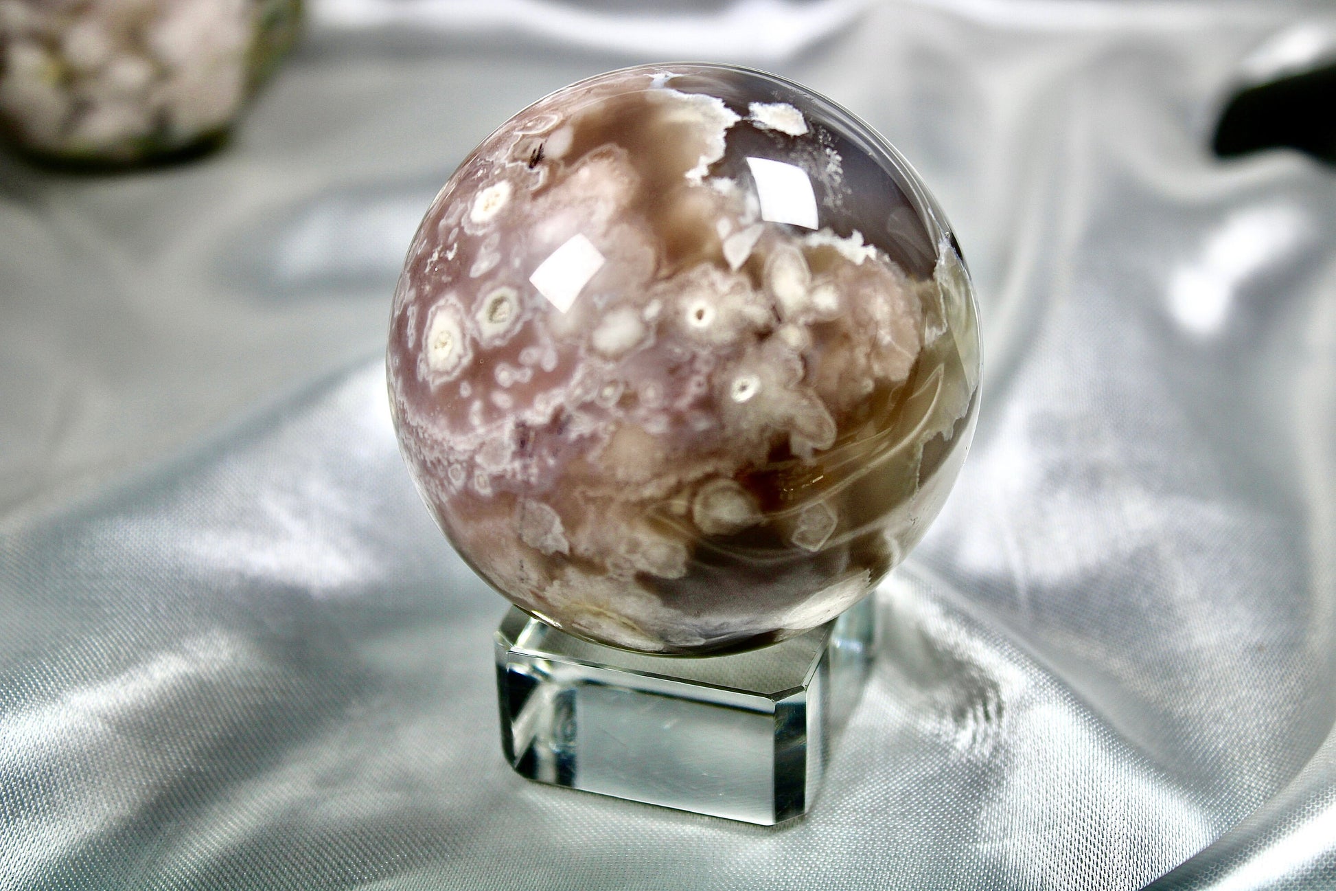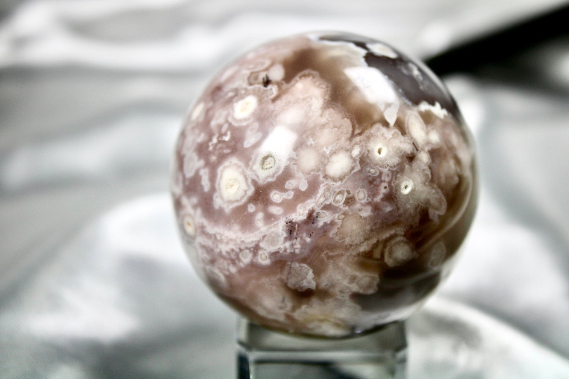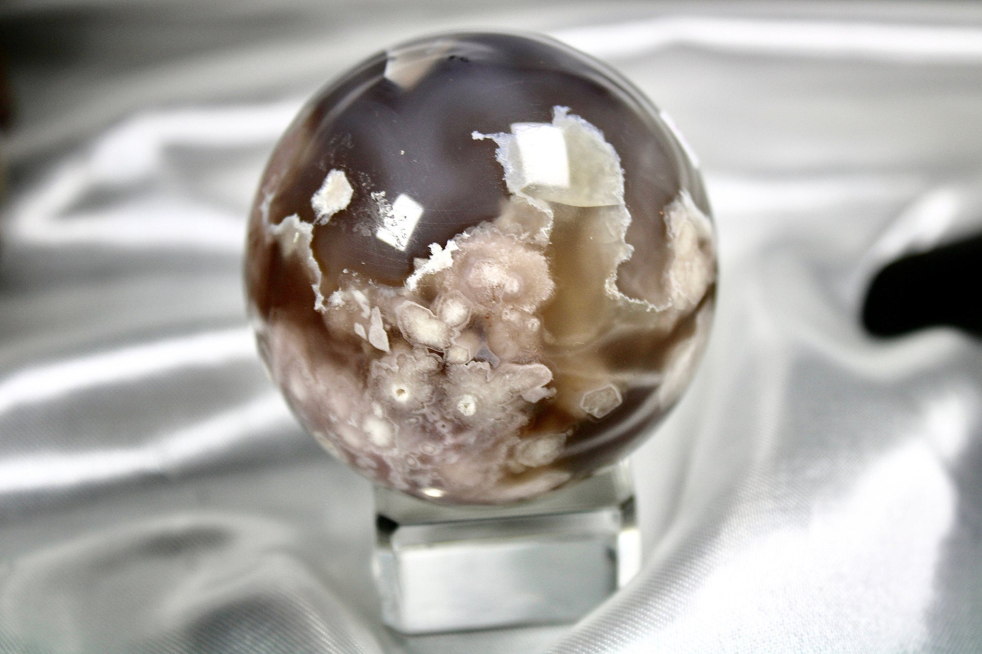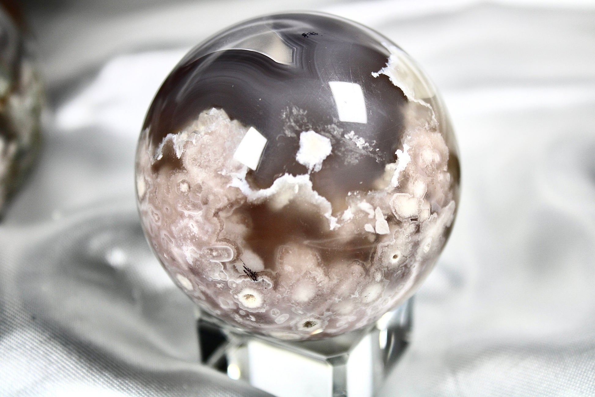 This sphere is a black flower agate sphere but has a lot of natural tones too it and isn’t as black as some of the others, so that’s why I have haven’t put it in the description. But it still has a beautiful dark colour and the pink flowers have beautiful details. It really is a very special piece
