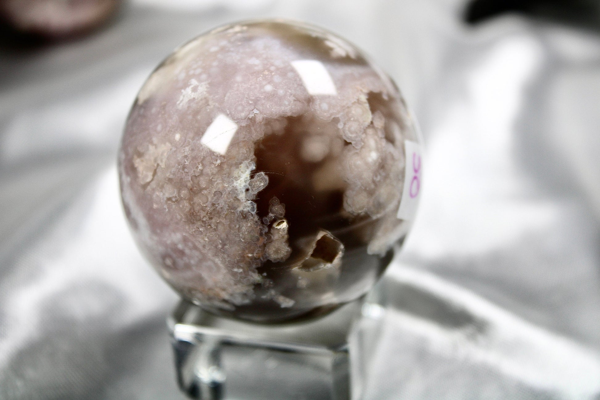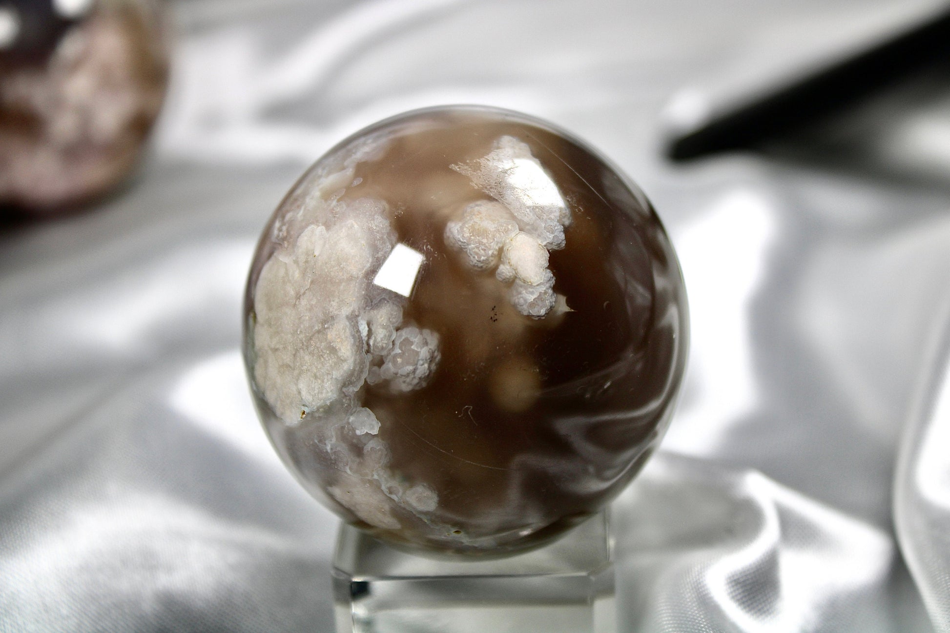 Gorgeous black flower agate sphere in more natural tones with beautiful pink flowers