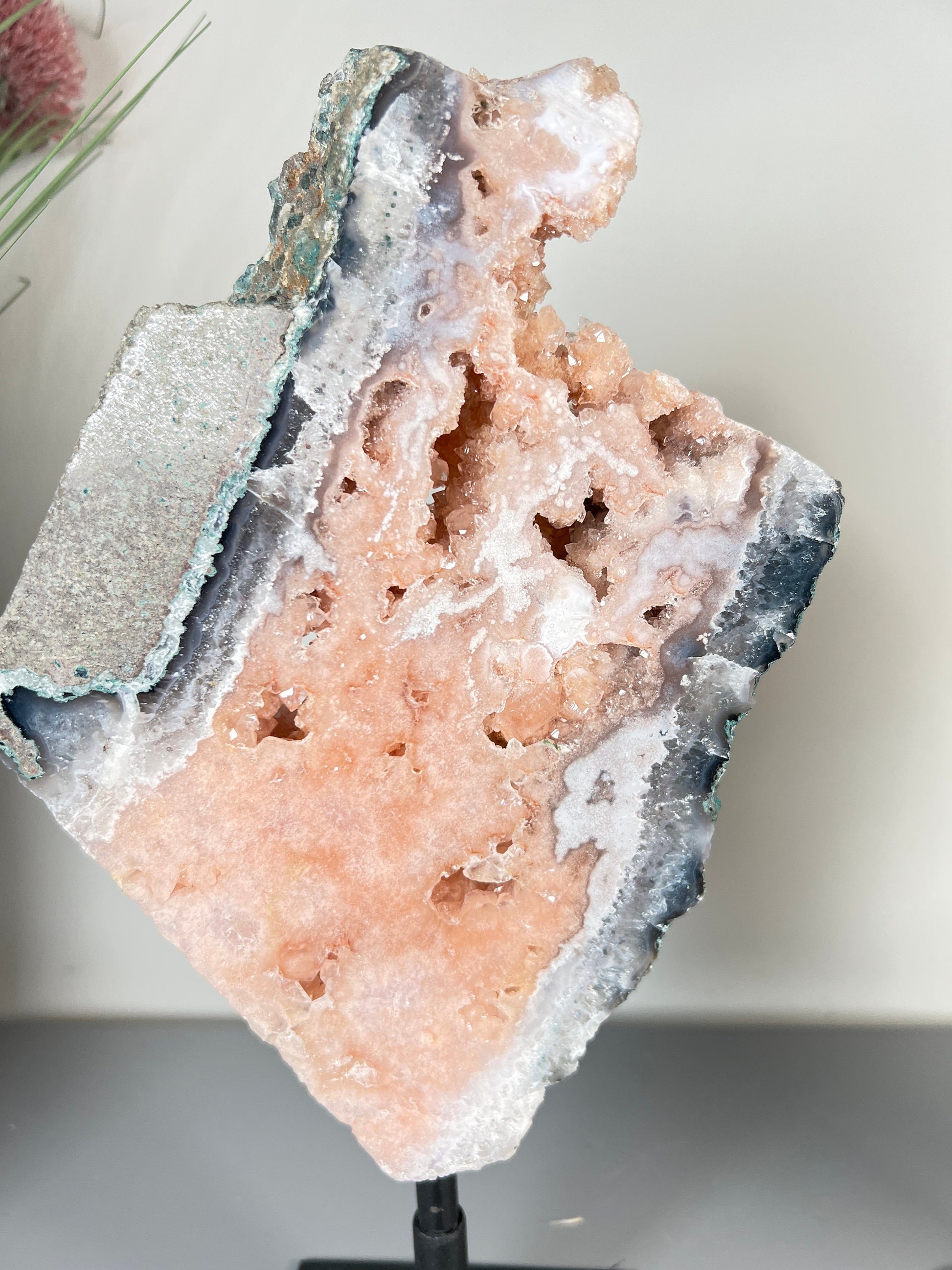 Gorgeous, peach, pink amethyst with smoky crystallisation and natural stone edging slab on turntable stand