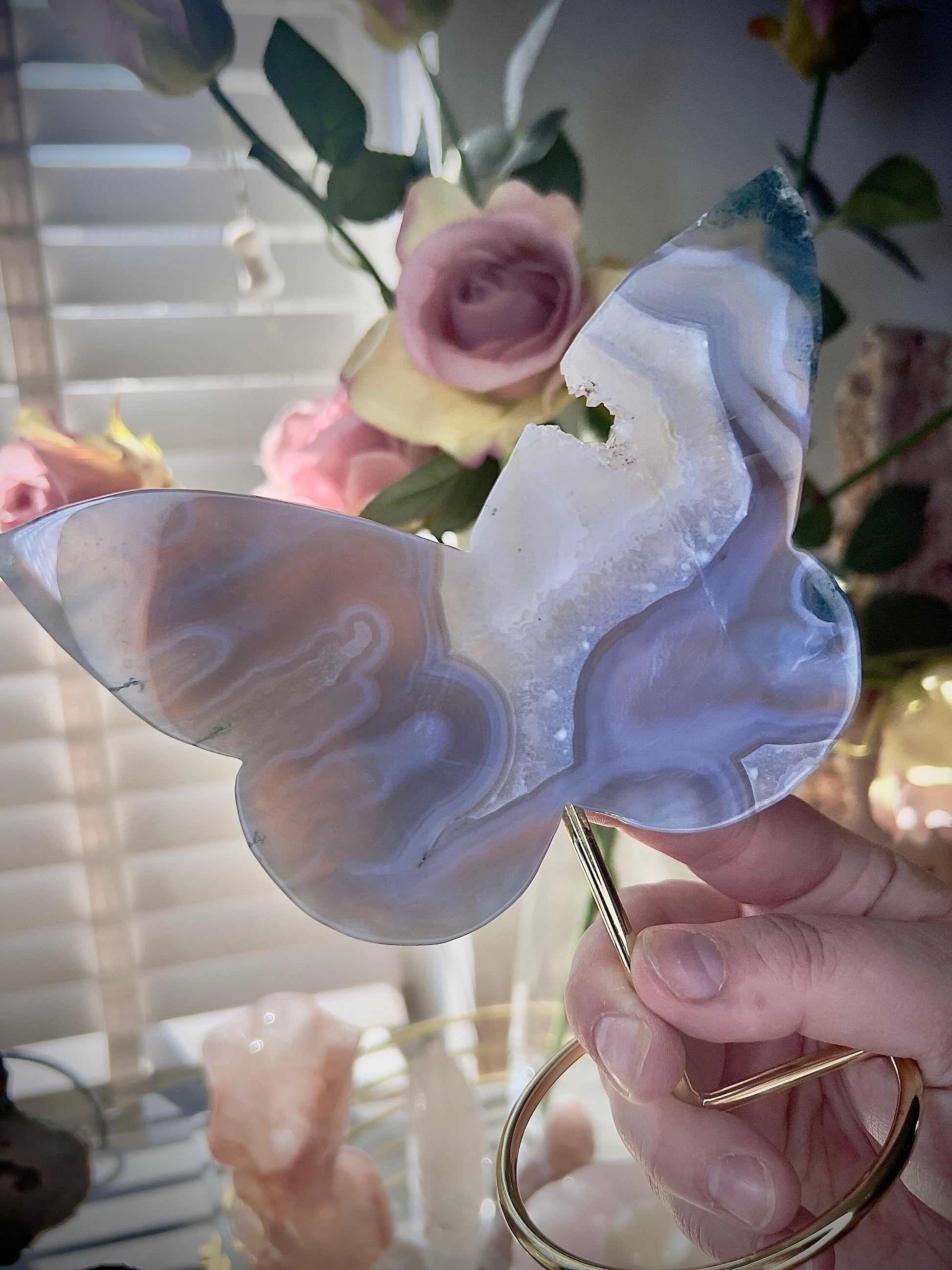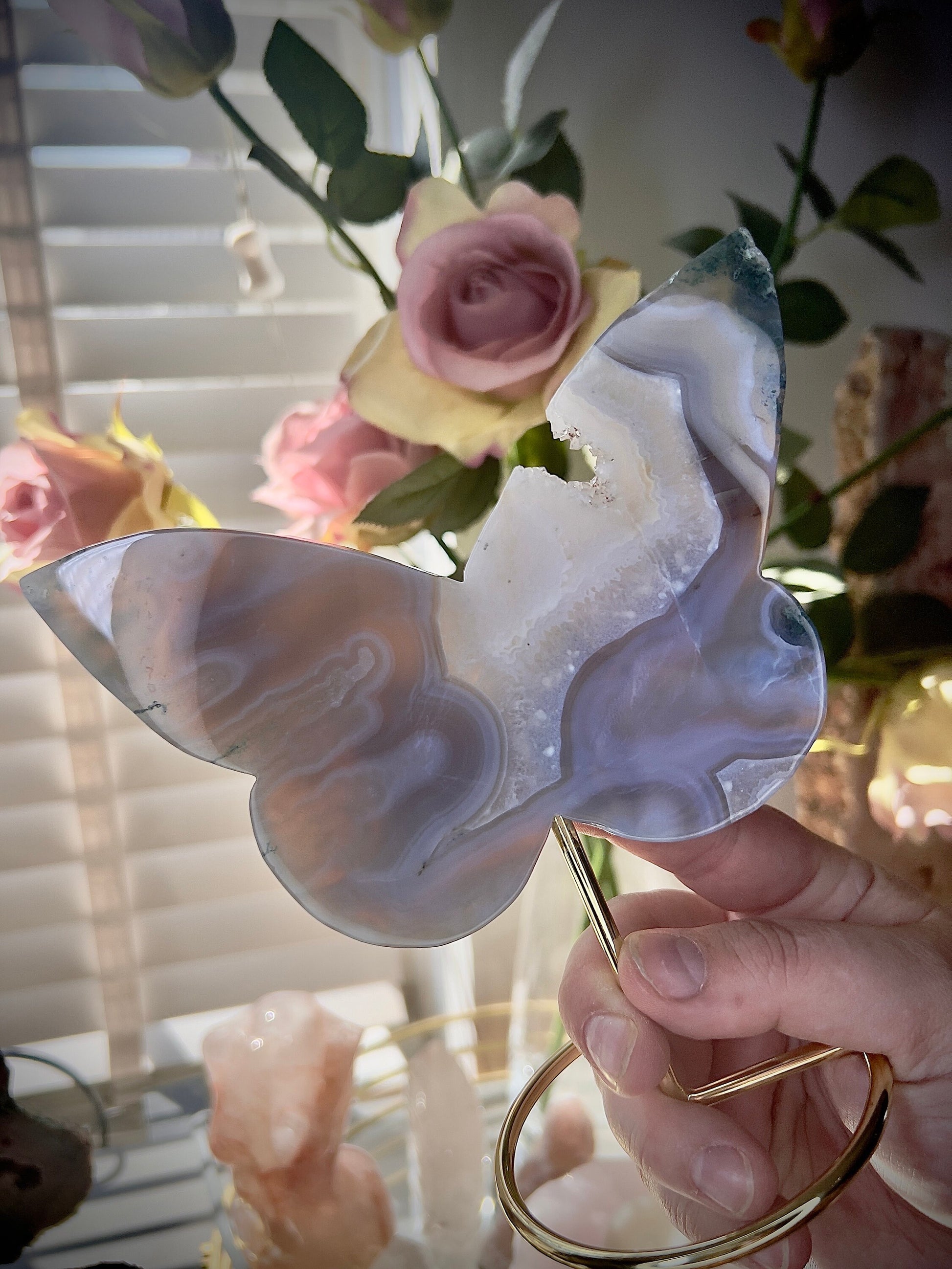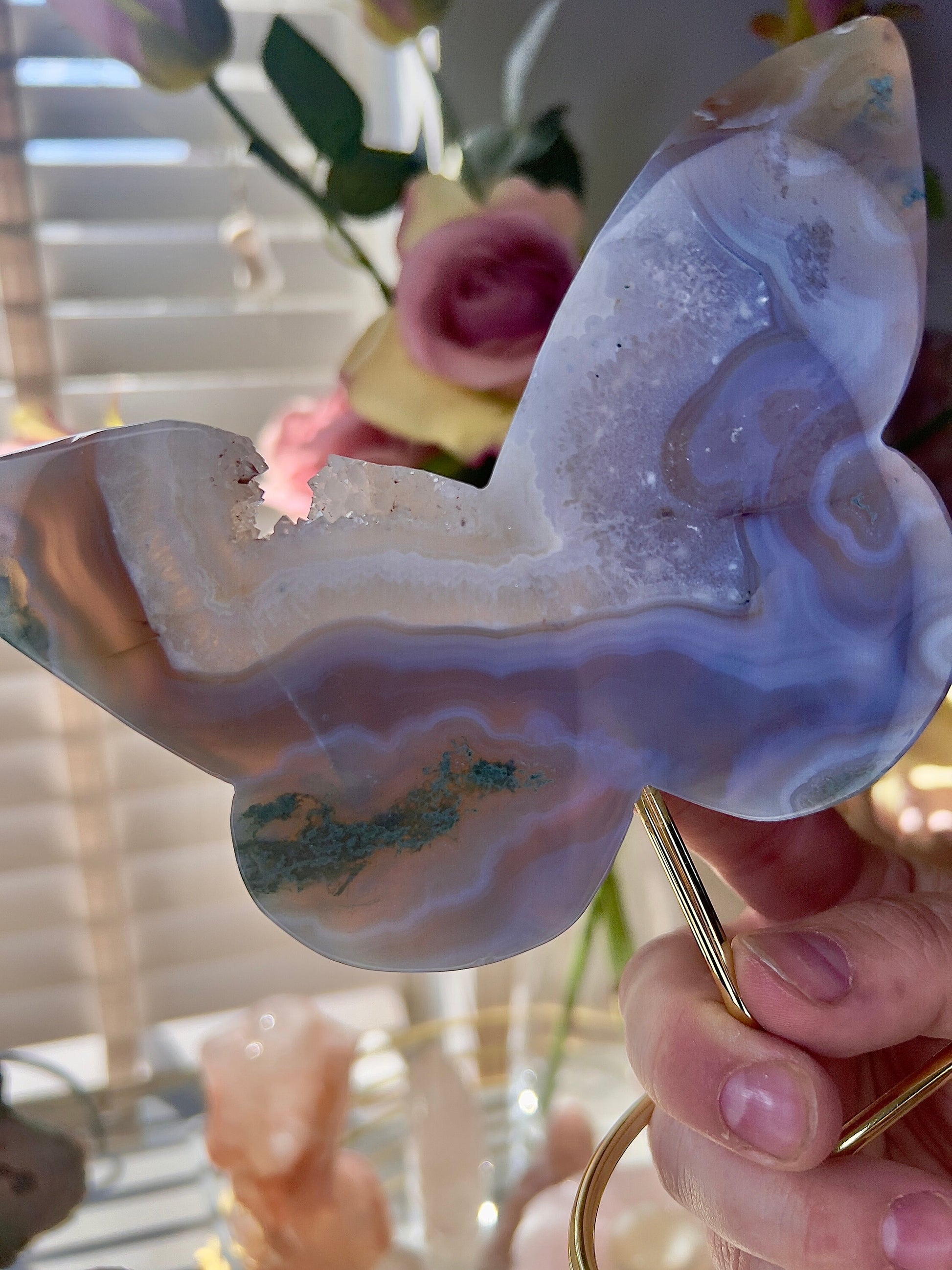 High grade, blue moss agate & quartz, butterfly with, gold pedestal stand