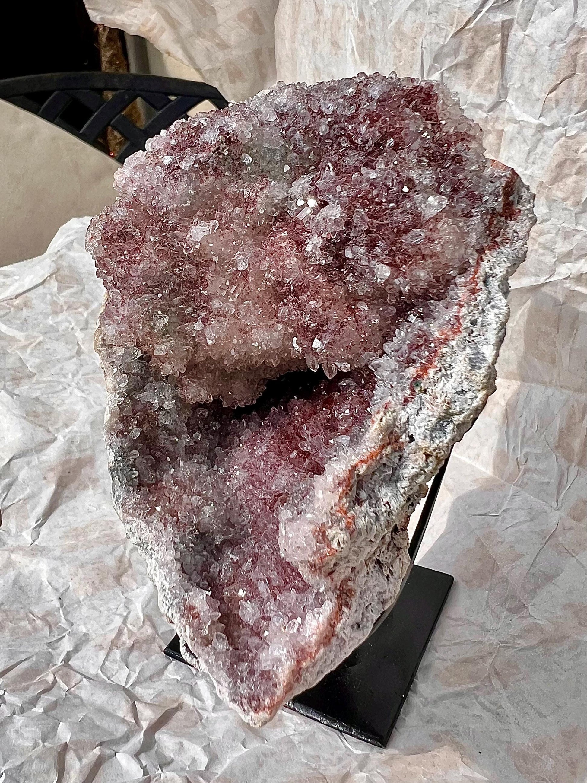 high grade, pink amethyst geode with red and pink toned sugar druzy stand