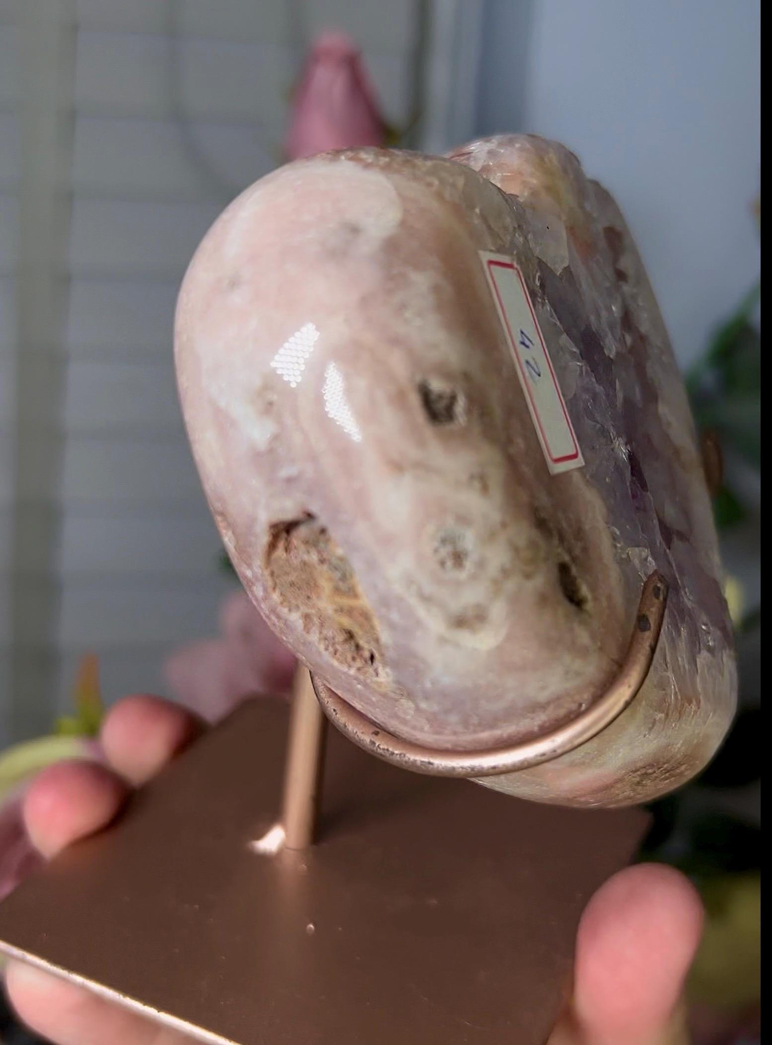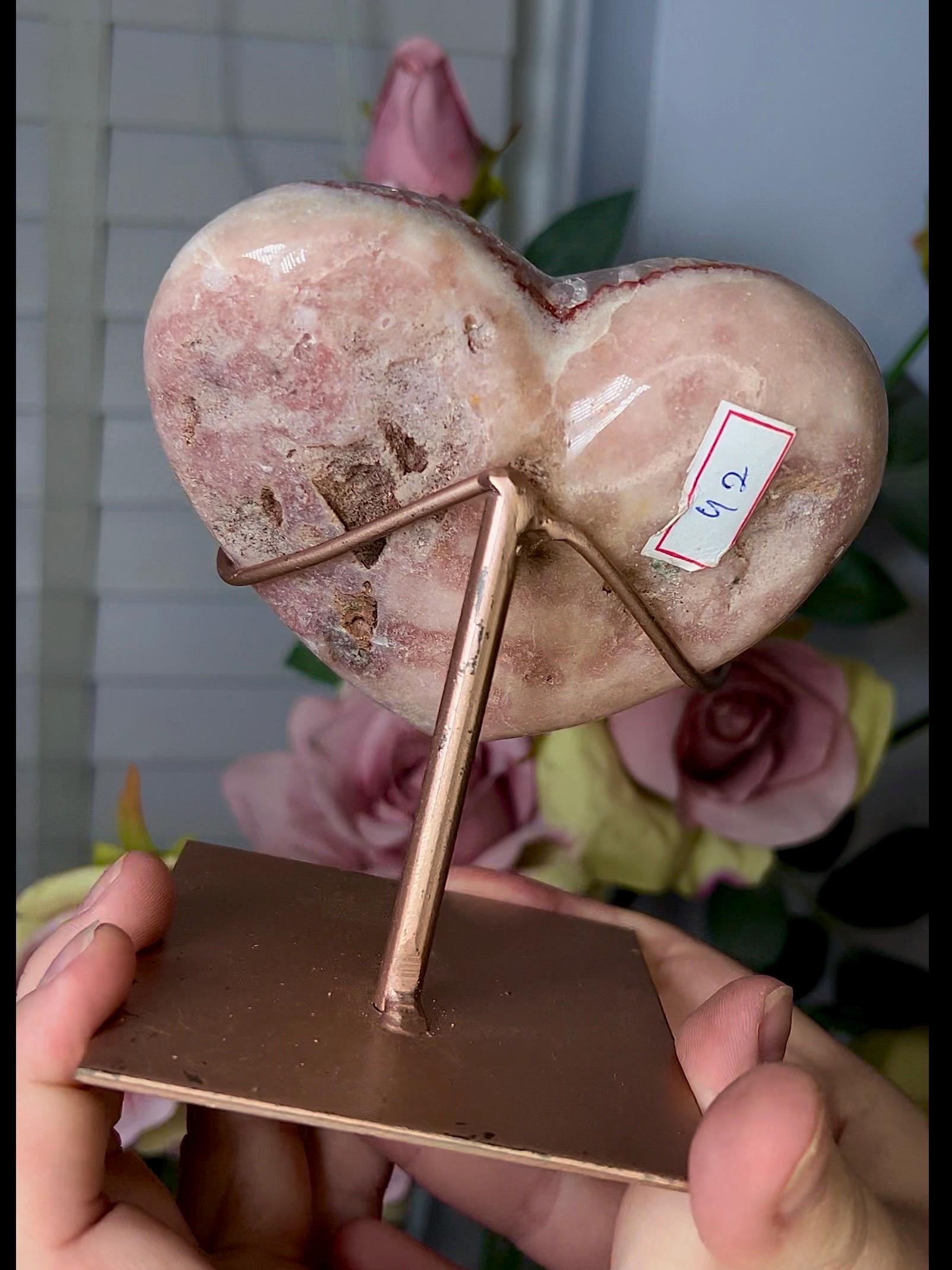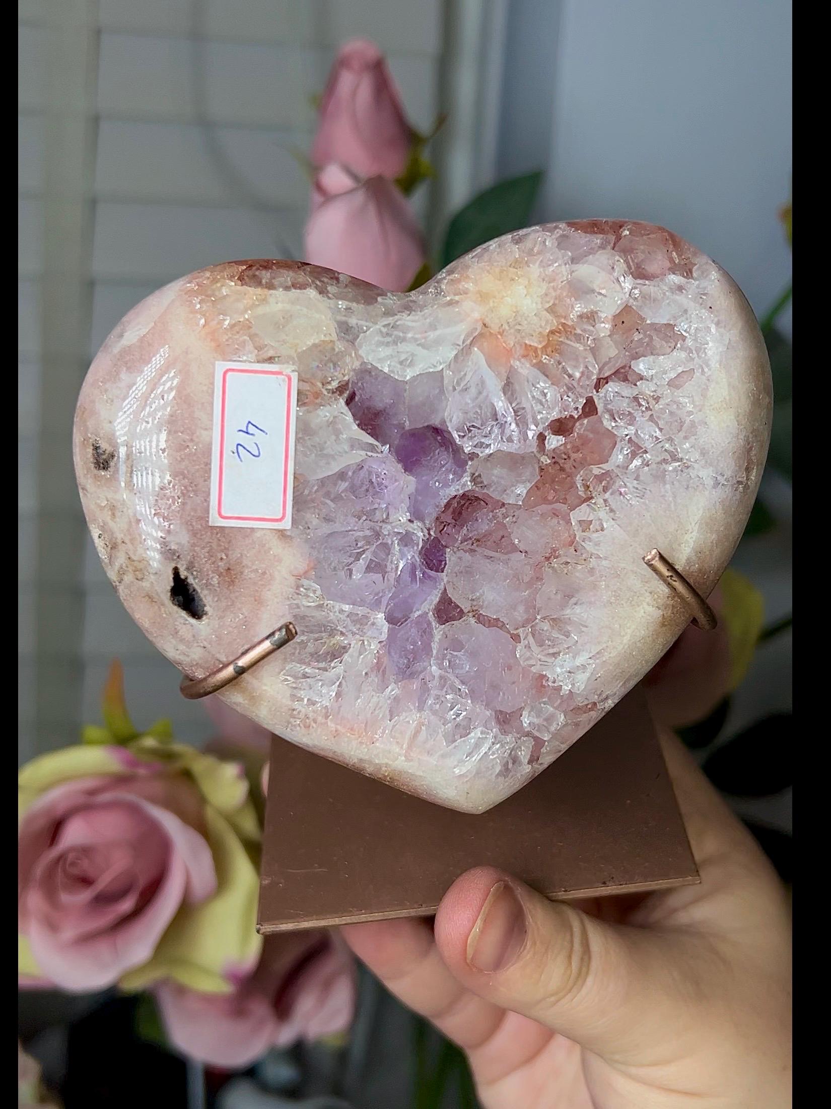 High grade, pink amethyst heart with a Beautiful flower, purple quartz & hematite lining 510g with stand