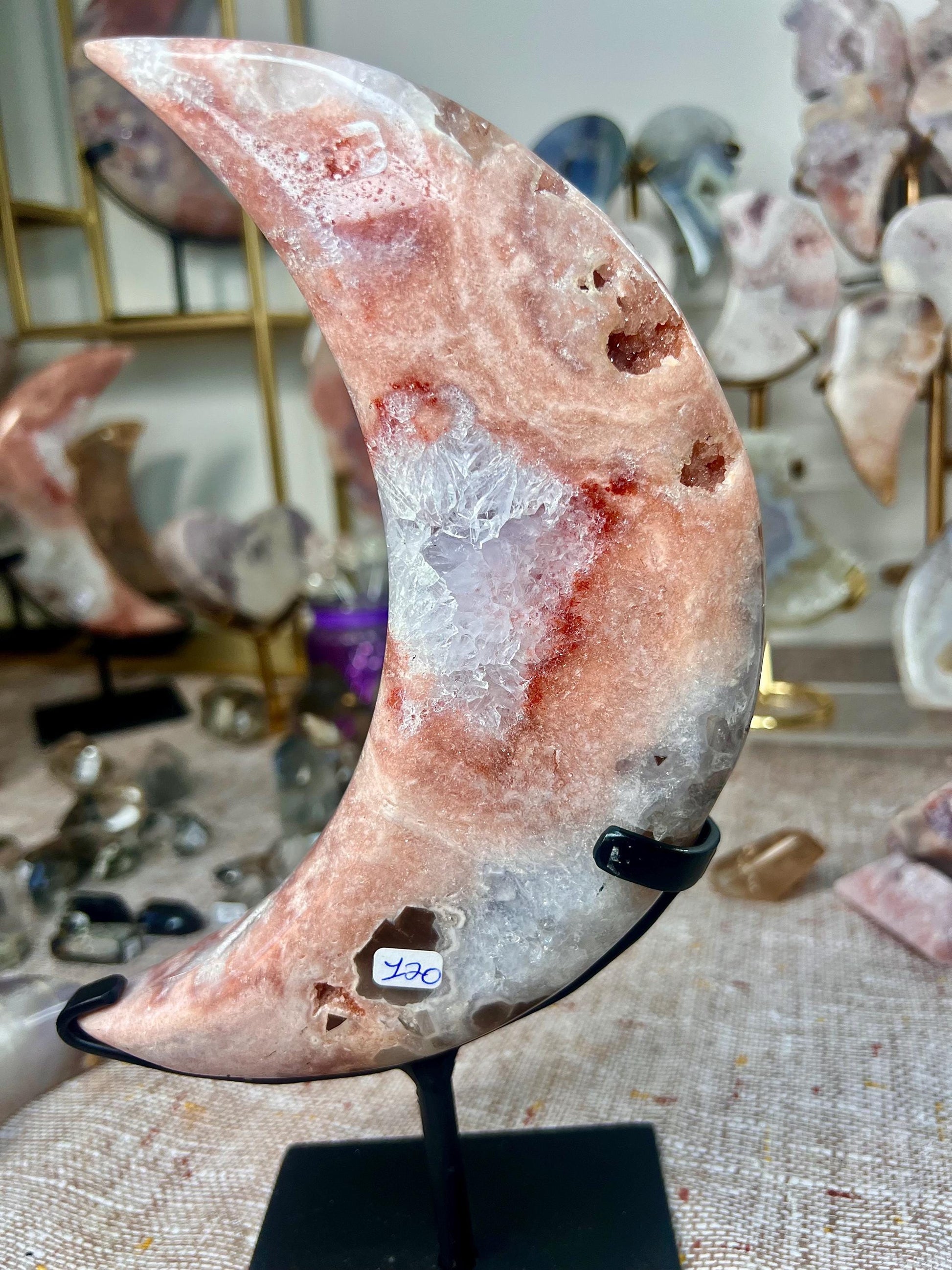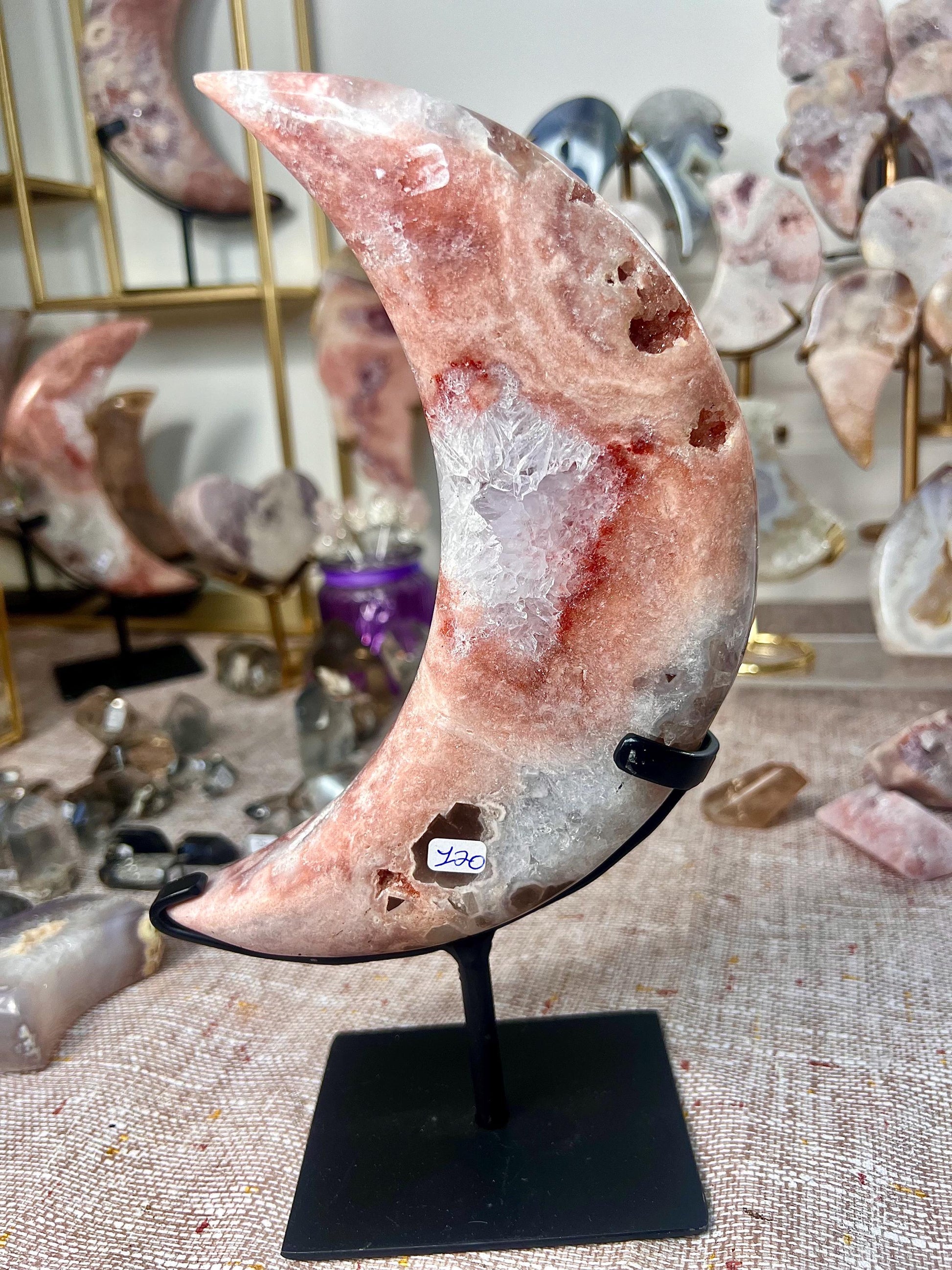 High grade, pink amethyst moon in pink, peach, red, & baby blue tones with gorgeous quartz