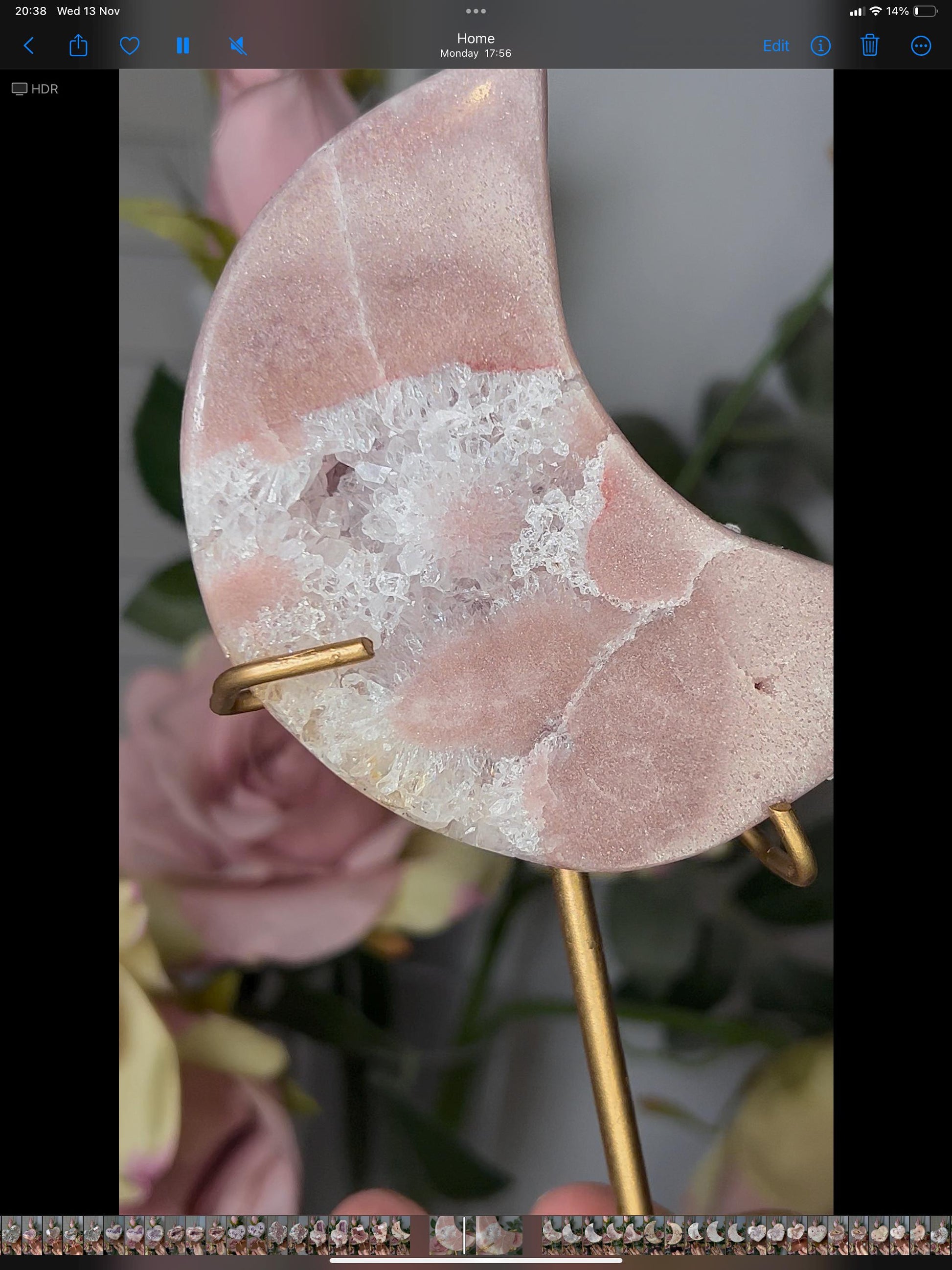 High grade, pink amethyst moon with quartz flowers and red hematite lining