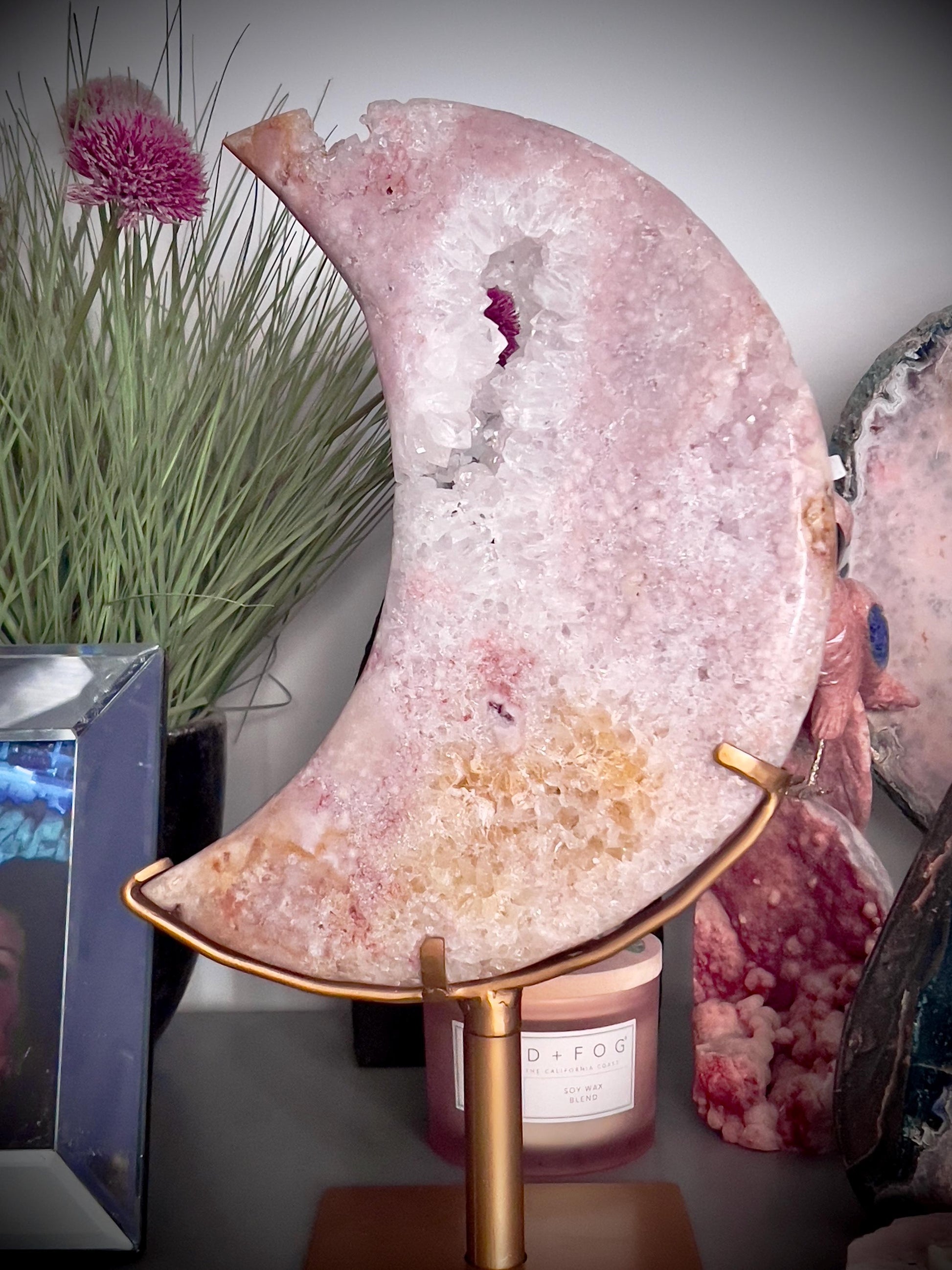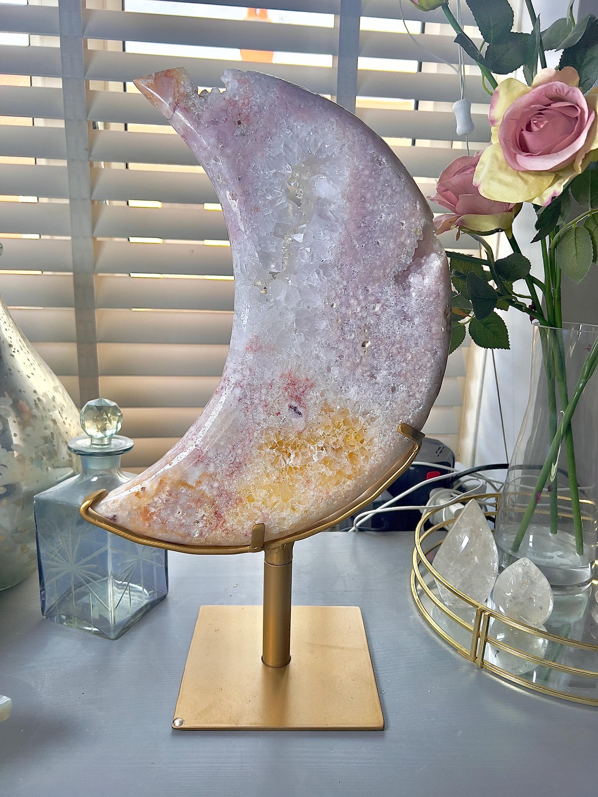 This beautiful sparkly moon is such a show stopper. She’s an amazing size with the prettiest pink colour and a lovely druzy part on her too. She also has an green jasper vein and her stand is customised.