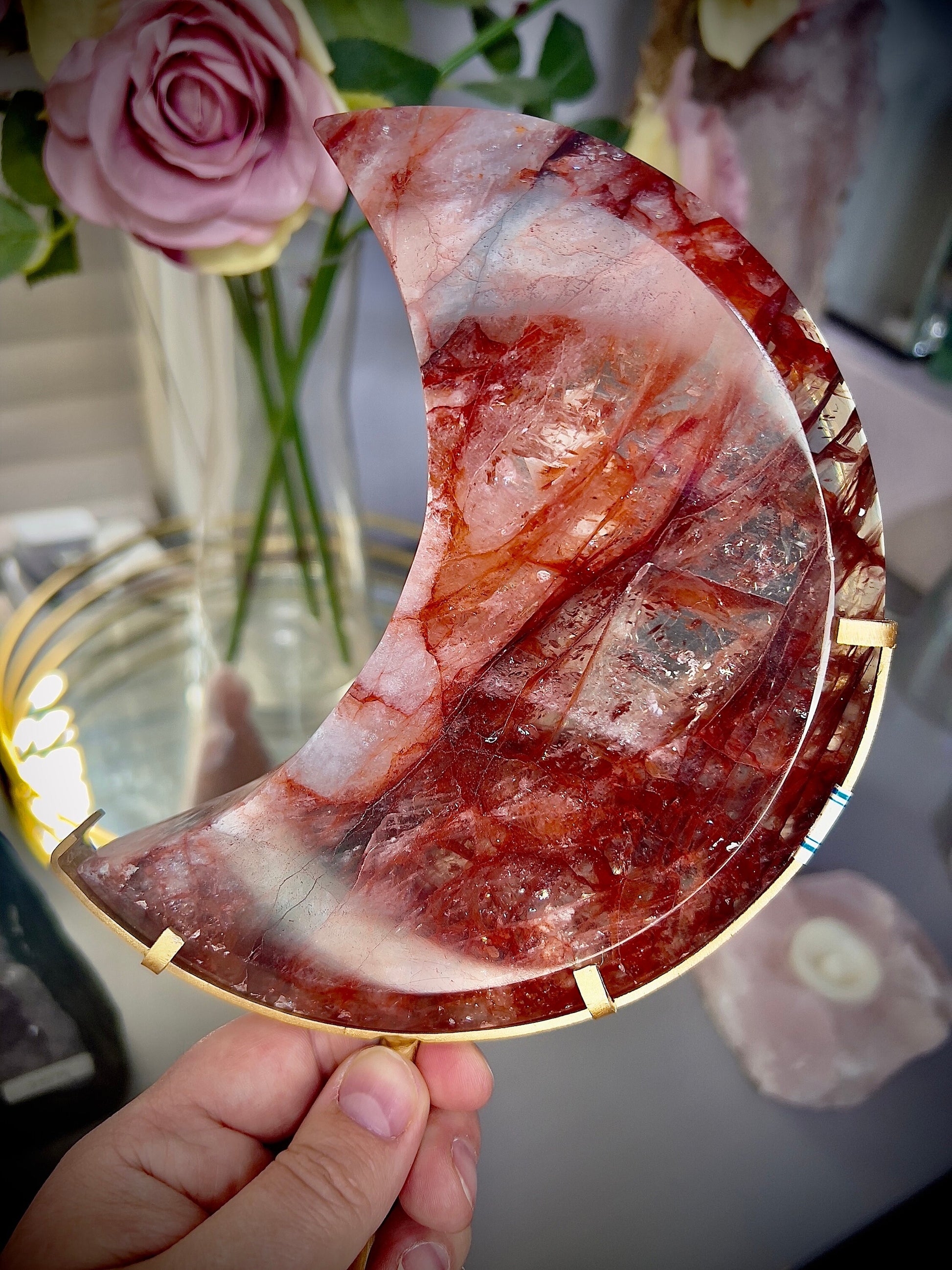 large, high grade, red fire quartz moon on stand