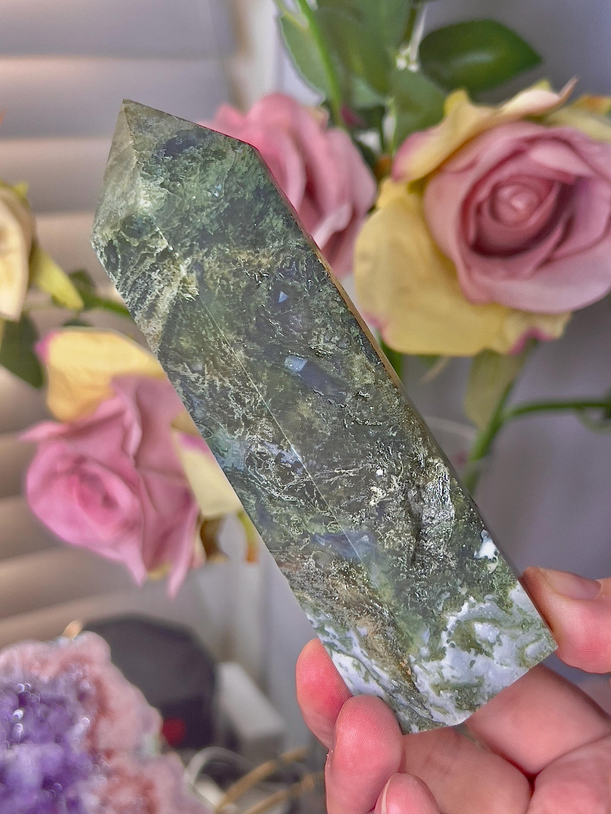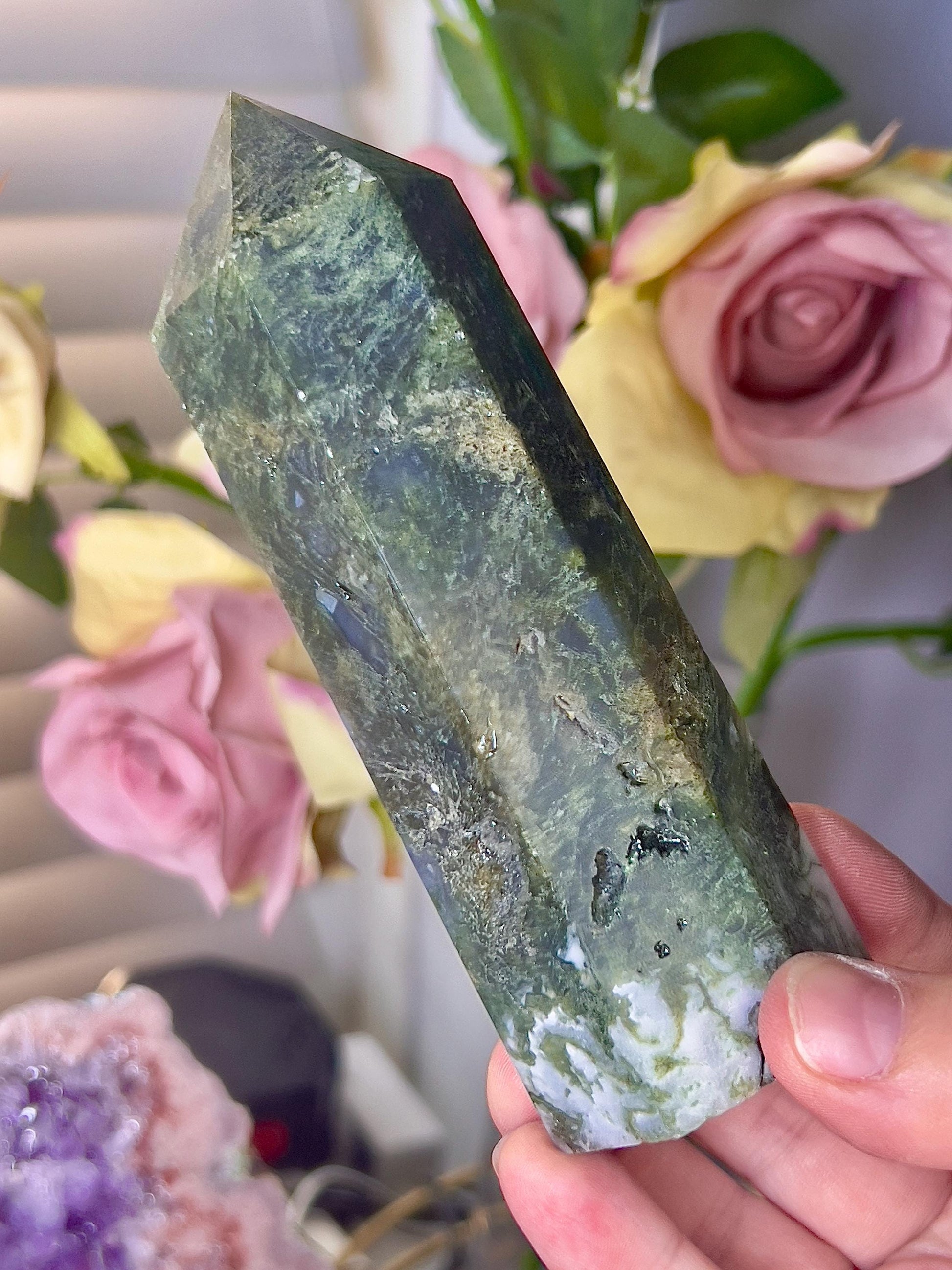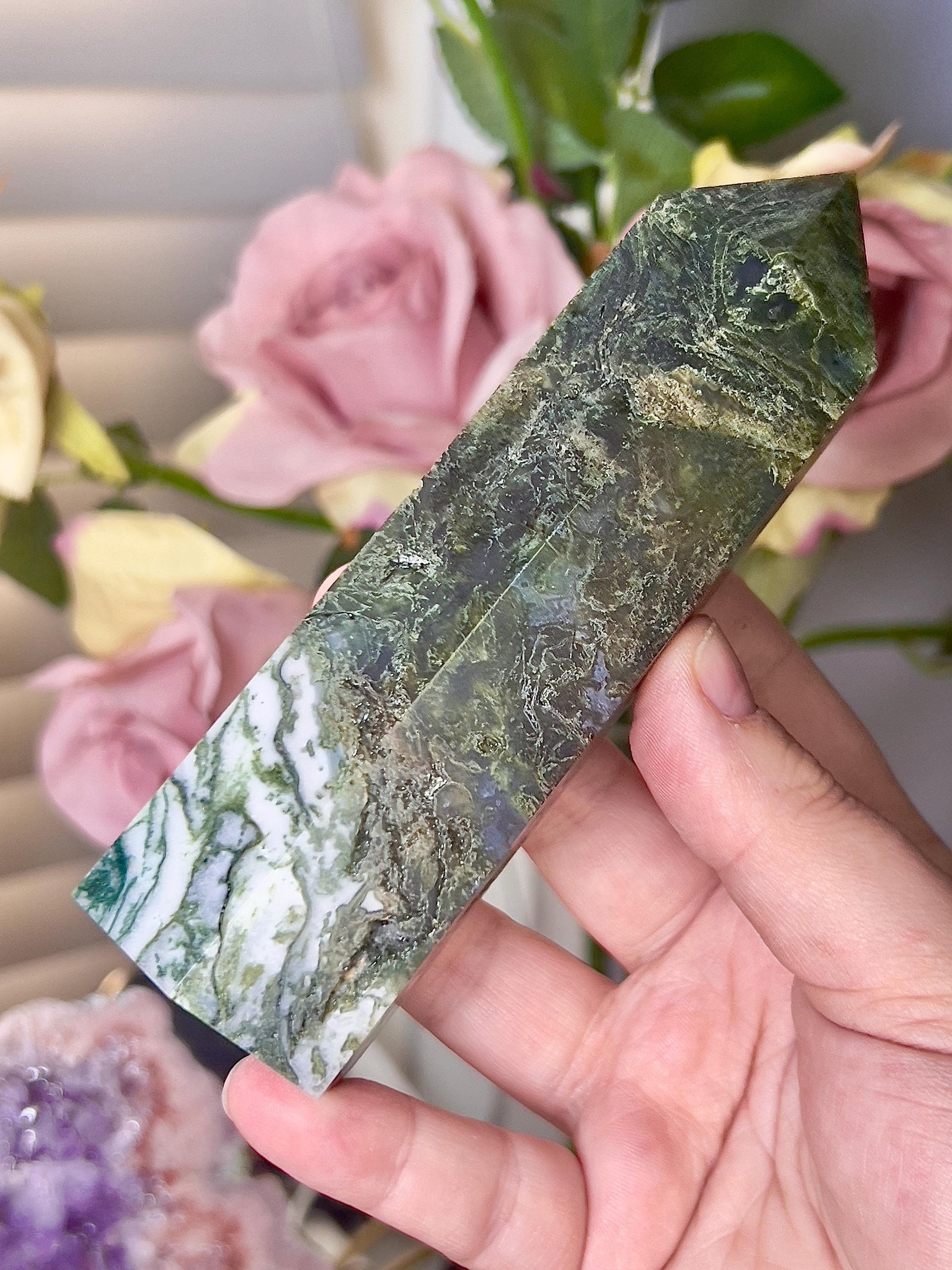 Large, moss agate tower 310g