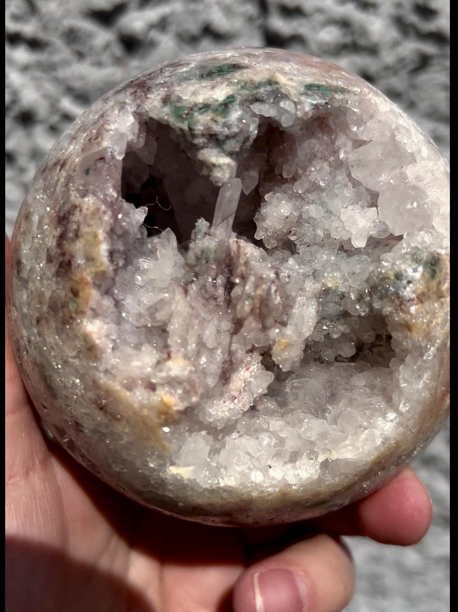 large, statement pink amethyst sphere with purple quartz ,jasper & sugar druzy with amazing quartz points