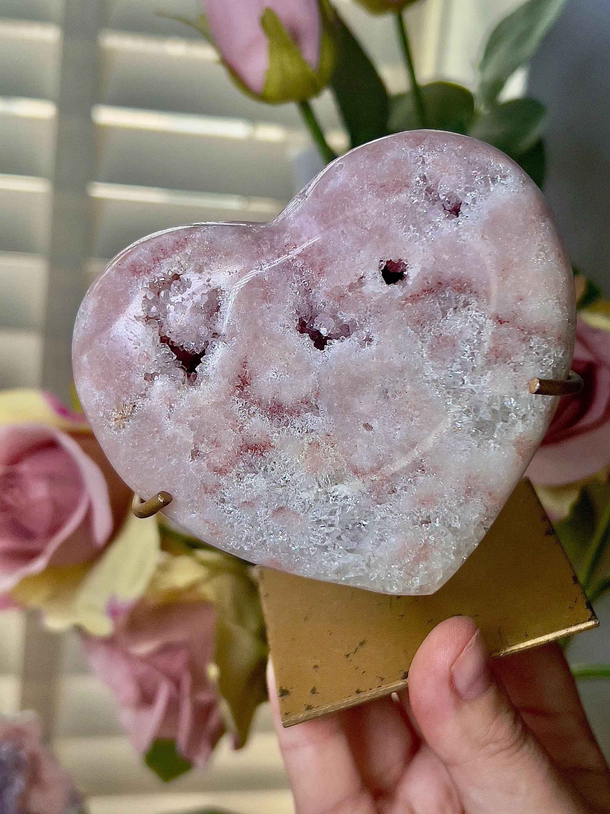 Pink amethyst heart with quartz druzy and stand which has scratches (discount added) can easily be repainted