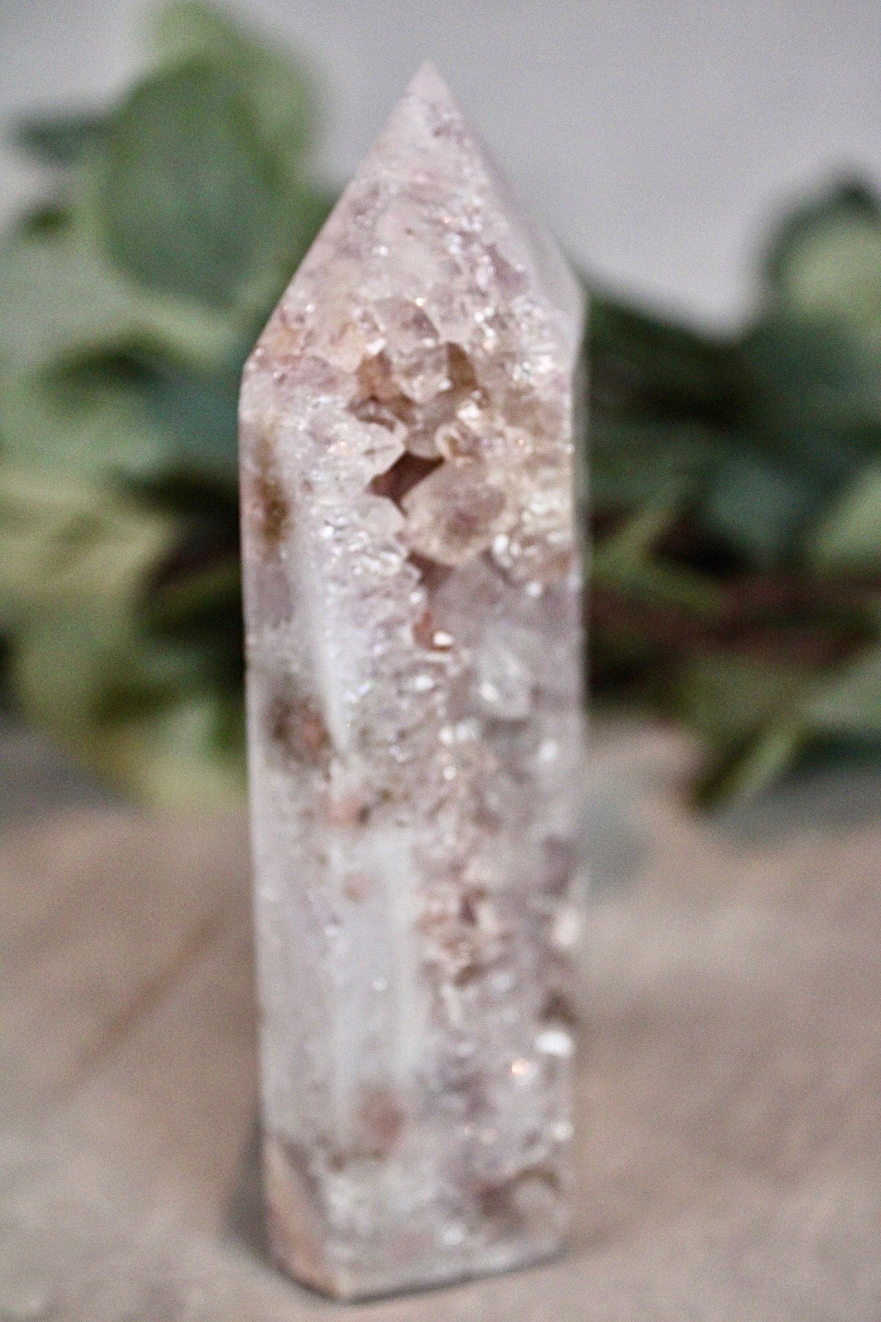 Snow pink amethyst tower with quartz druzy - 390g 13cm