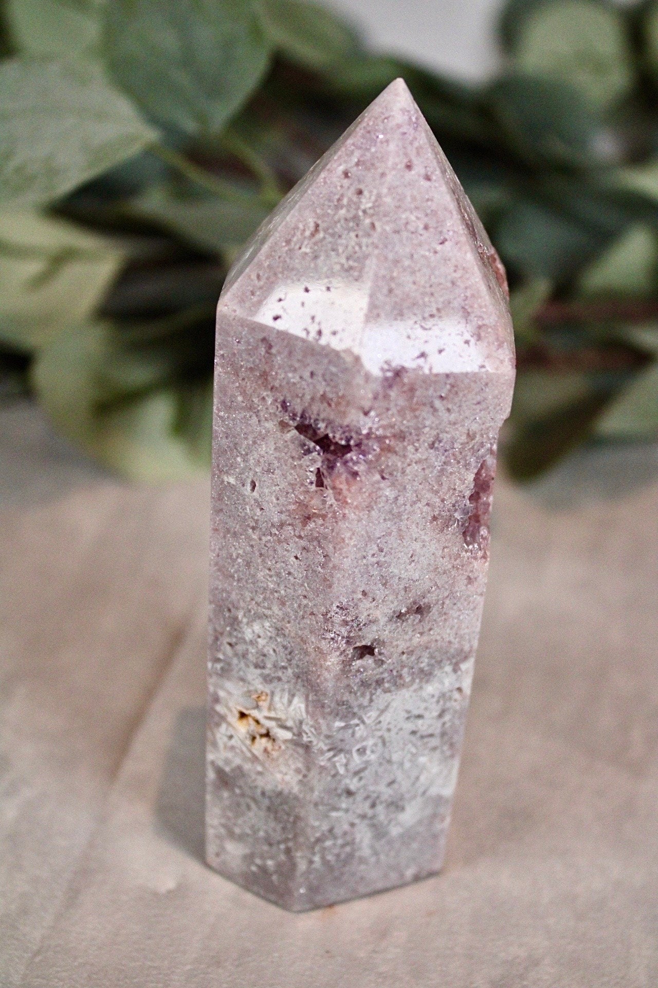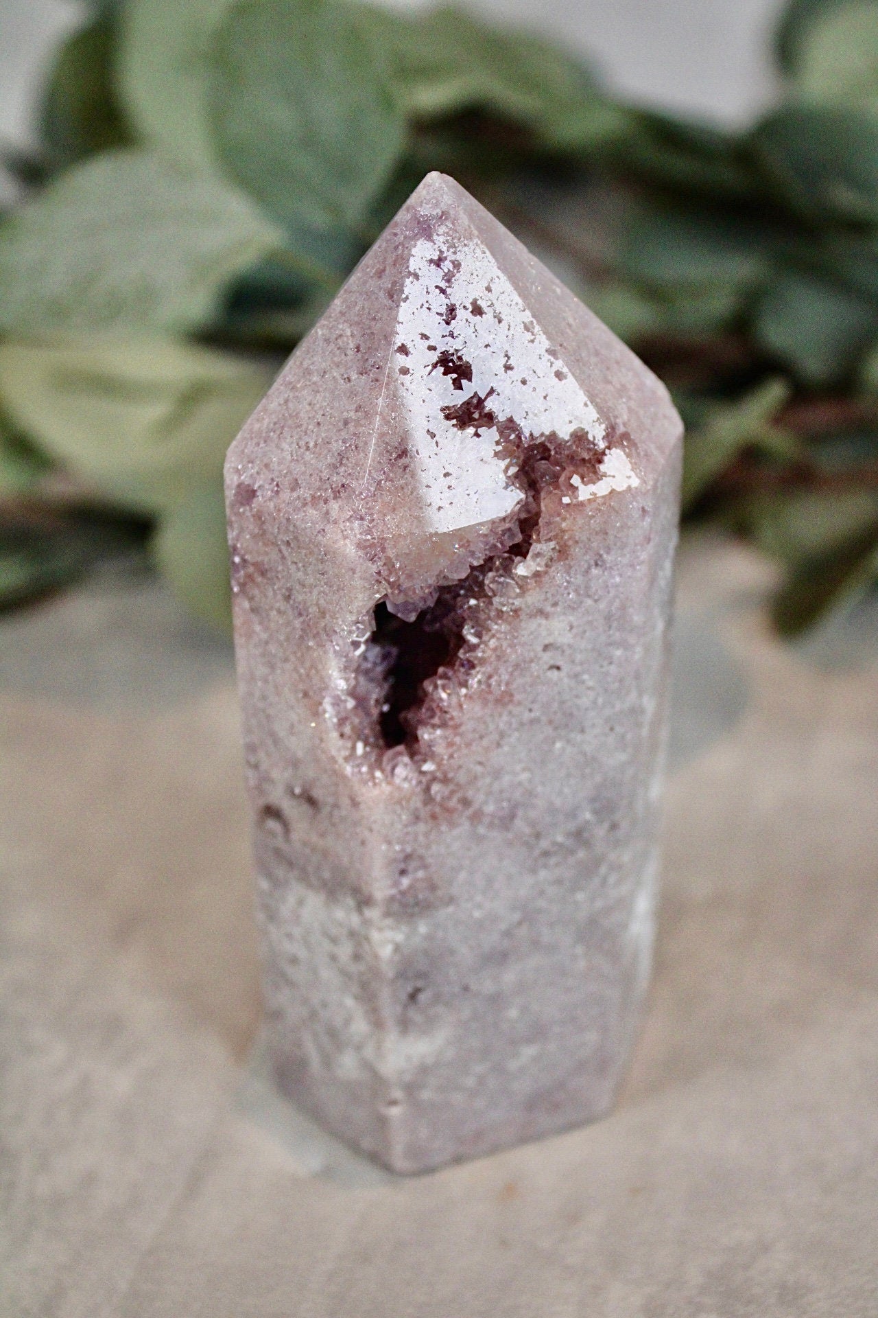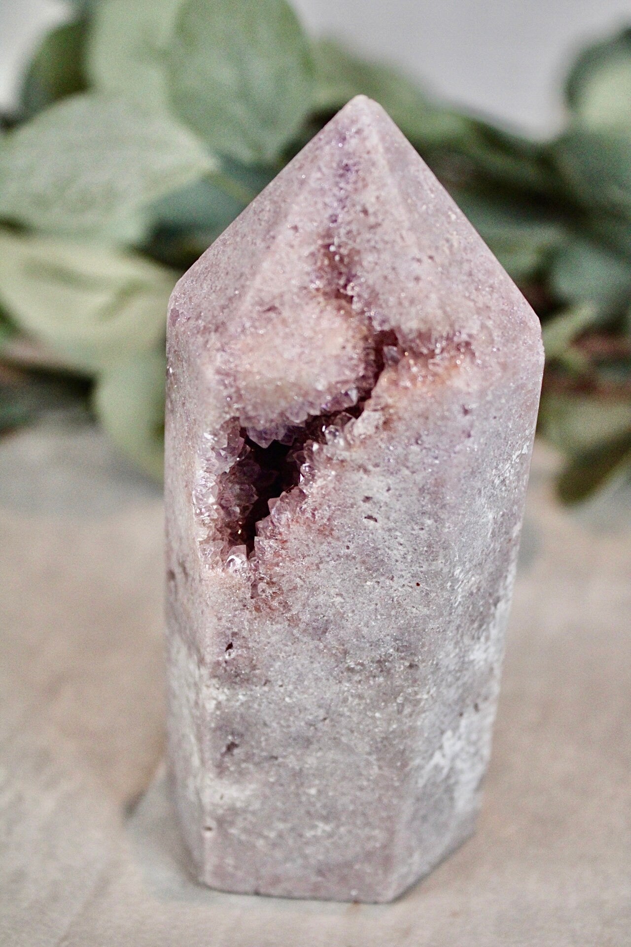 Snowy pink amethyst tower with druzy cave - 450g 12cm (H)