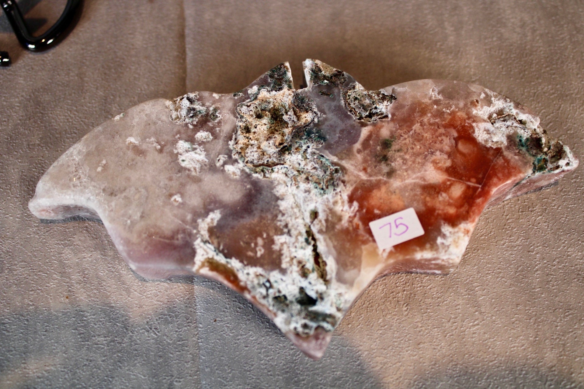 Stunning, high quality, multi coloured, pink amethyst bat carving 340g 15cm(W) 9cm(H)