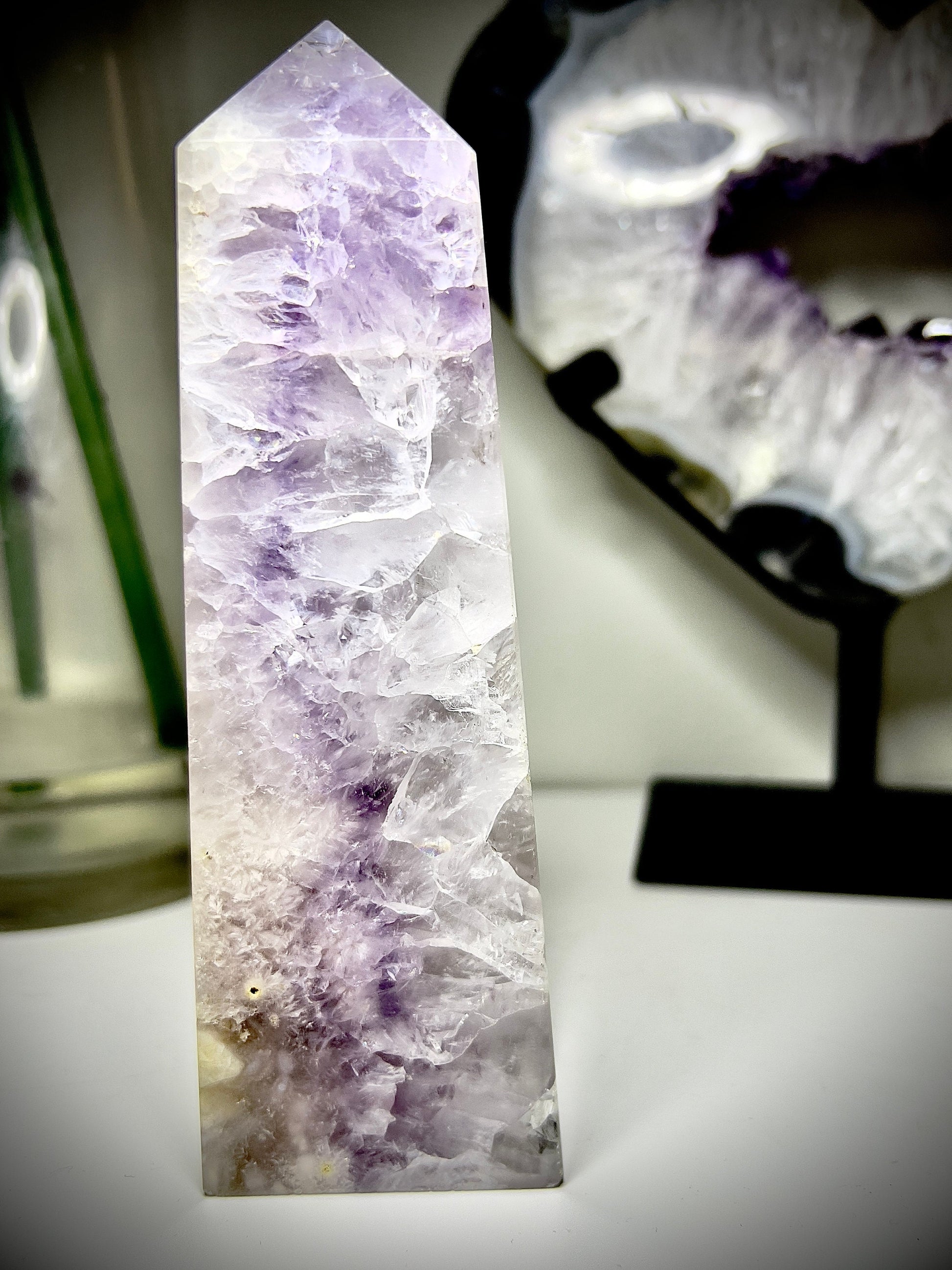 This tower is so uniquely beautiful. With its amethyst, quartz glass l like features and beautiful detailed green flowers running down the side. It is definitely a very special piece.